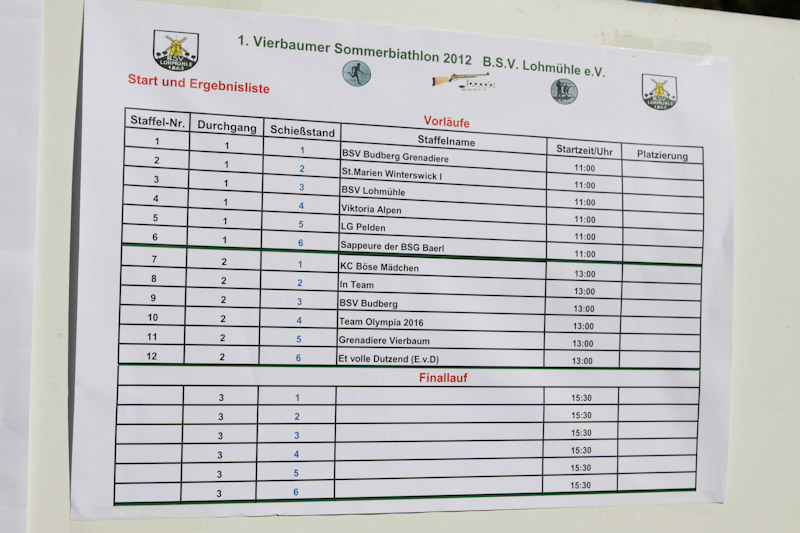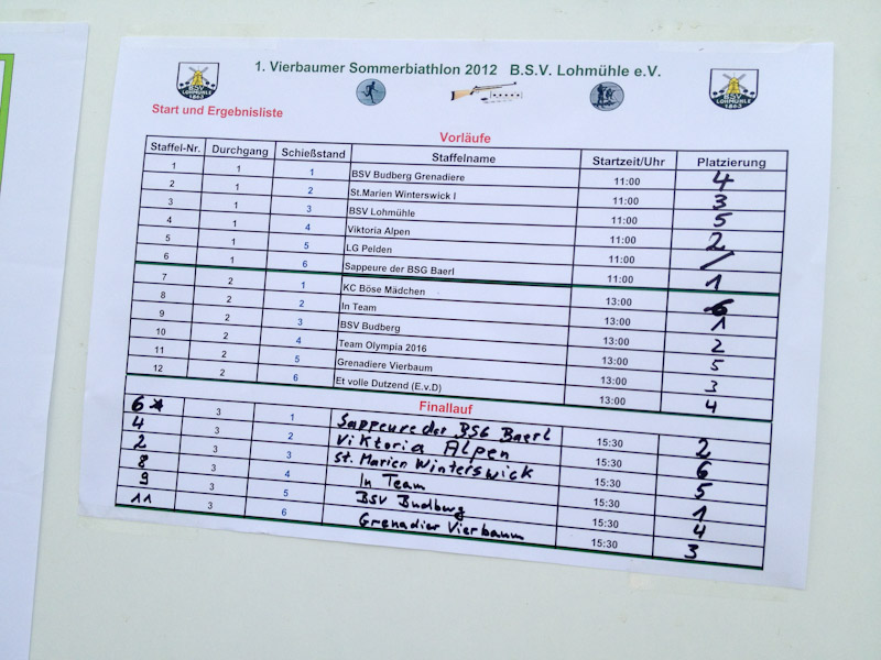 Beim 1. Vierbaumer Sommerbiathlon konnten sich die Sappeure nach hartem Wettkampf gegen 11 Gegner-Teams auf den 2. Platz kämpfen. Bereits im Vorlauf erkämpfte sich das Team mit einem grandiosen ersten Platz in der Gruppe den Einzug ins Finale.