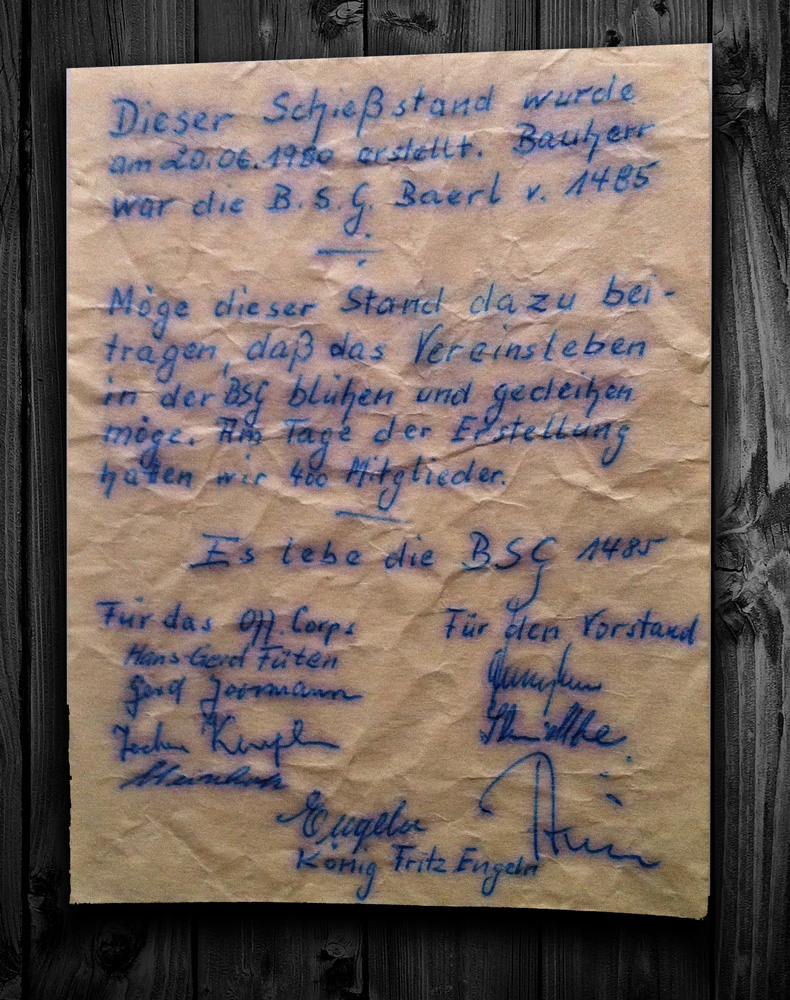 Dieser Schießstand wurde am 20.06.1980 erstellt. Bauherr war die B.S.G Baerl v. 1485.