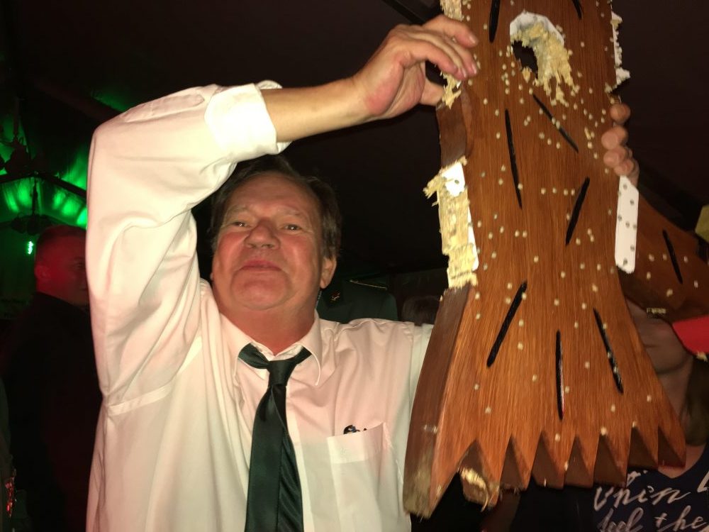 Leider erwies sich auch in diesem Jahr der Holzvogel wieder als äußerst zäher Geselle: Unter Flutlicht löste sich der Rumpf des Vogels mit den verbliebenen Preisen Reichsapfel und Kopf erst nach dem 393. Schuss um 22.40 Uhr von der Stange und kürte Reiner Pütz (König 2003) nach dem goldenen Schuss zum neuen Kaiser.