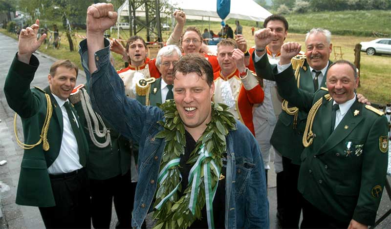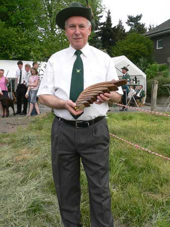 Im weiteren Verlauf reduzierte sich der Aspirantenkreis auf zunächst 7 Anwärter, von denen sich in der Endphase dann Norbert Oppelt und Peter Gratenberg bei strömendem Regen – aber jeweils lautstark unterstützt von den Fan-Gruppen – einen fairen und bis zuletzt spannenden Wettkampf lieferten, aus dem Peter Gratenberg als Sieger und damit als neuer Schützenkönig hervorging.