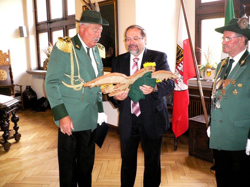 Präsident Heinz-Dieter Giesen bedankte sich für sie Einladung und überreichte als Gastgeschenk einen Original Königsvogel.